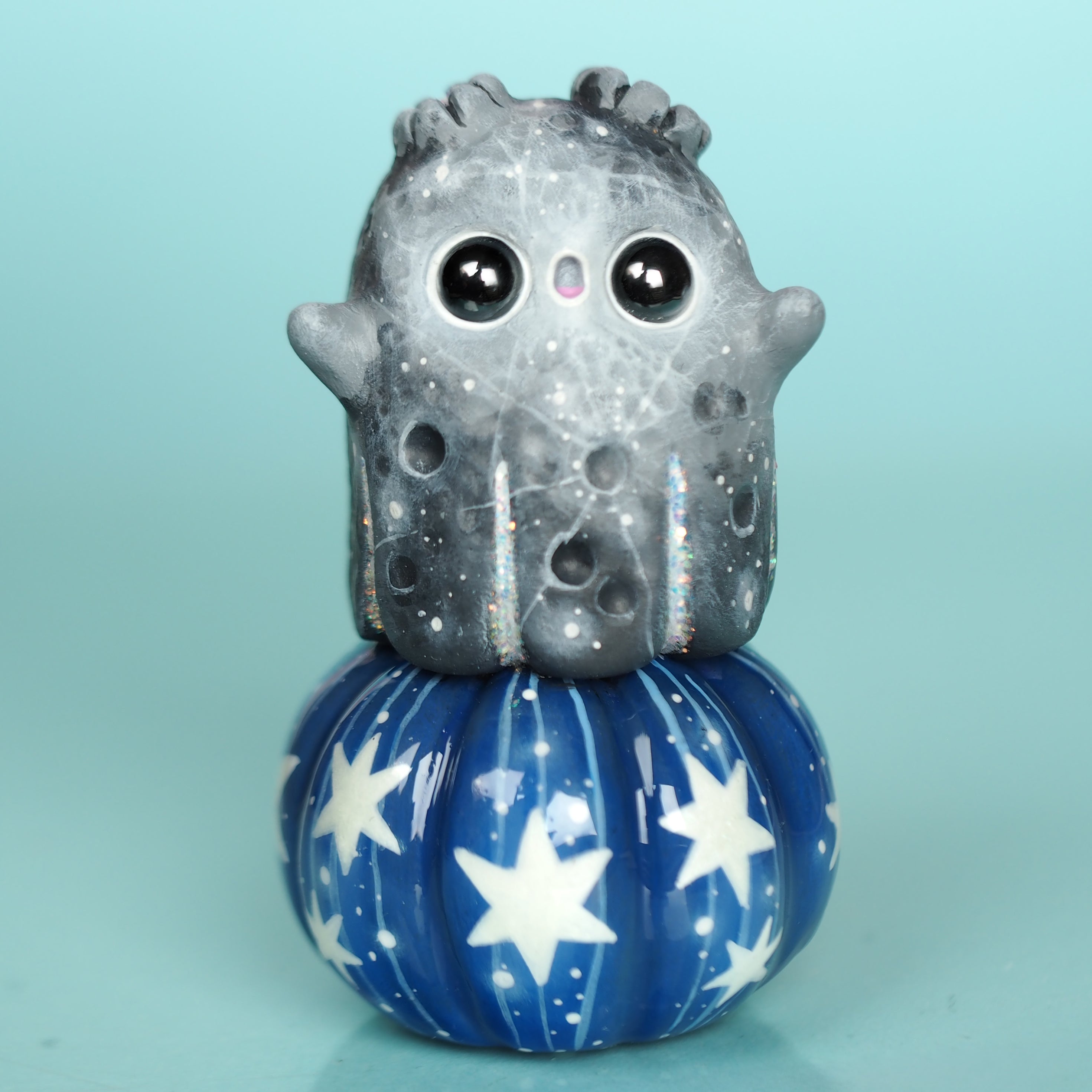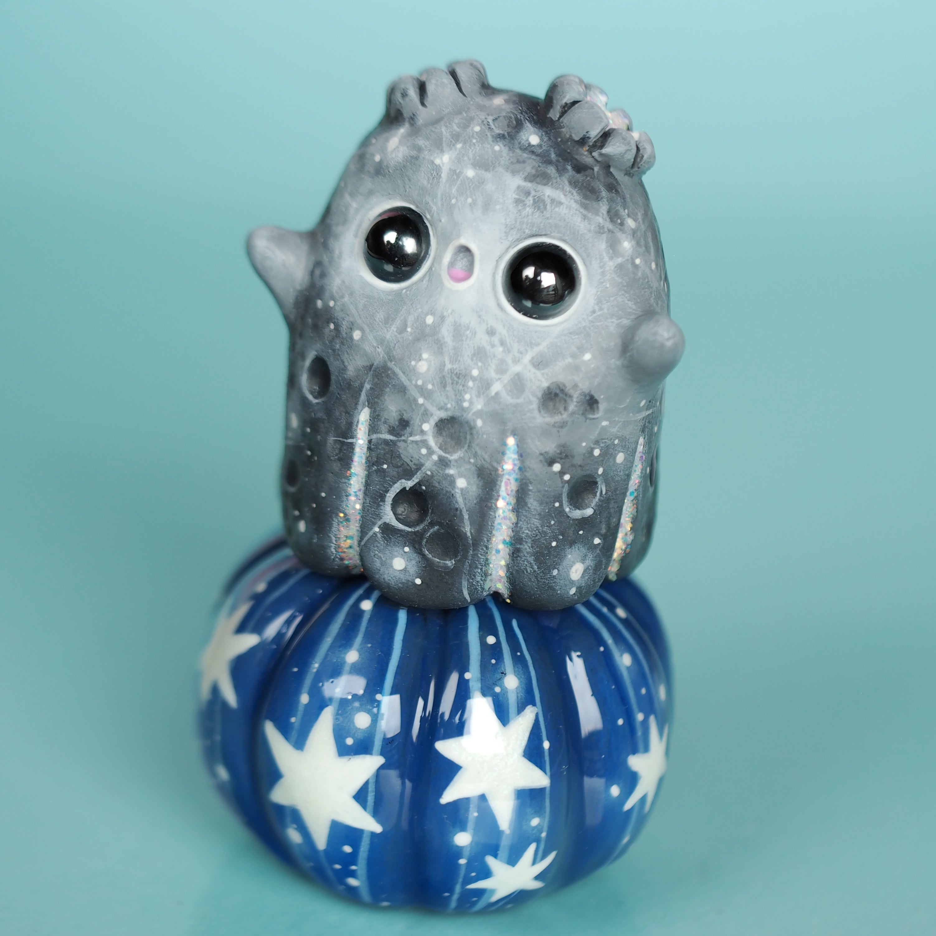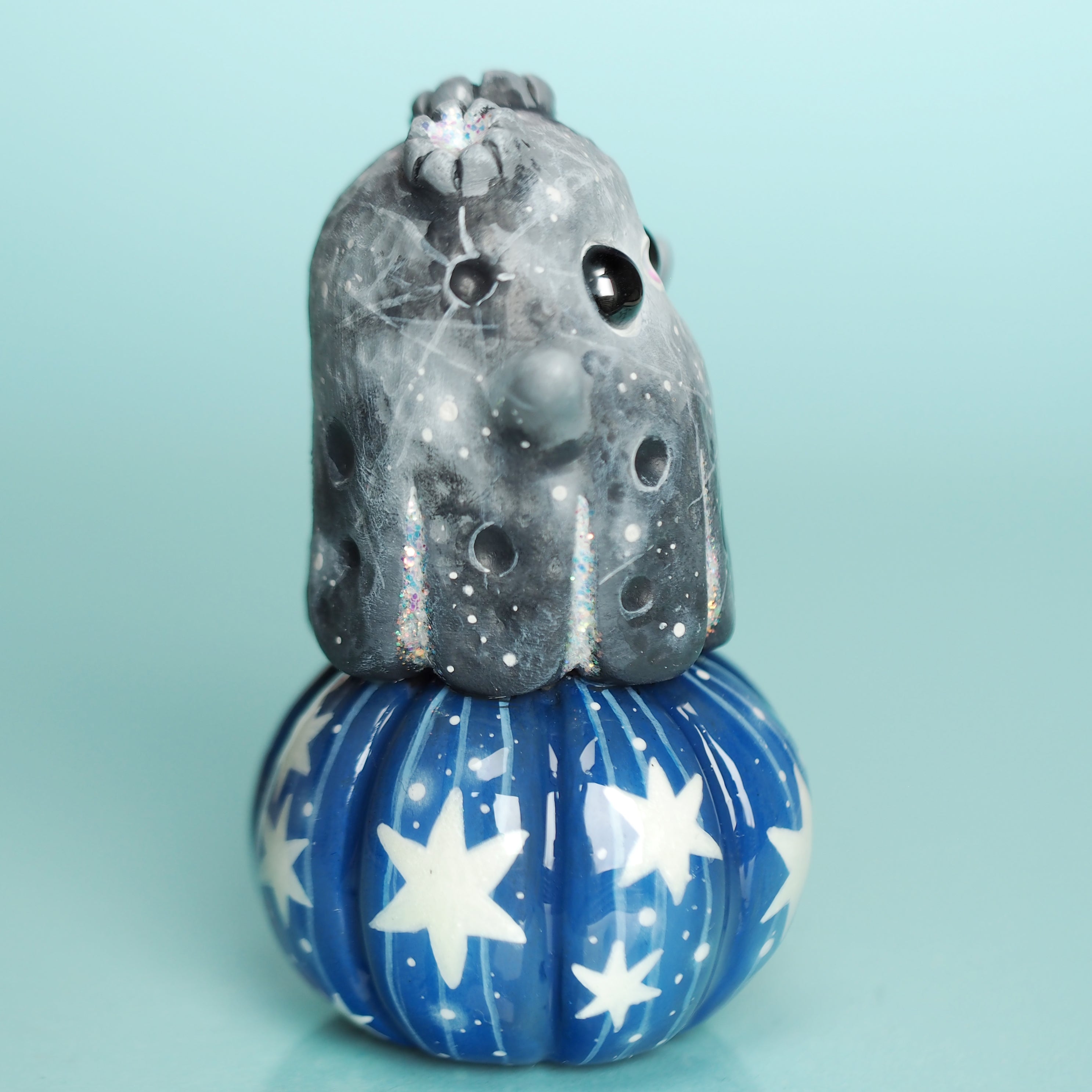 Luna on a Starry Pumpkin (Handmade Polymer Clay Sculpture)