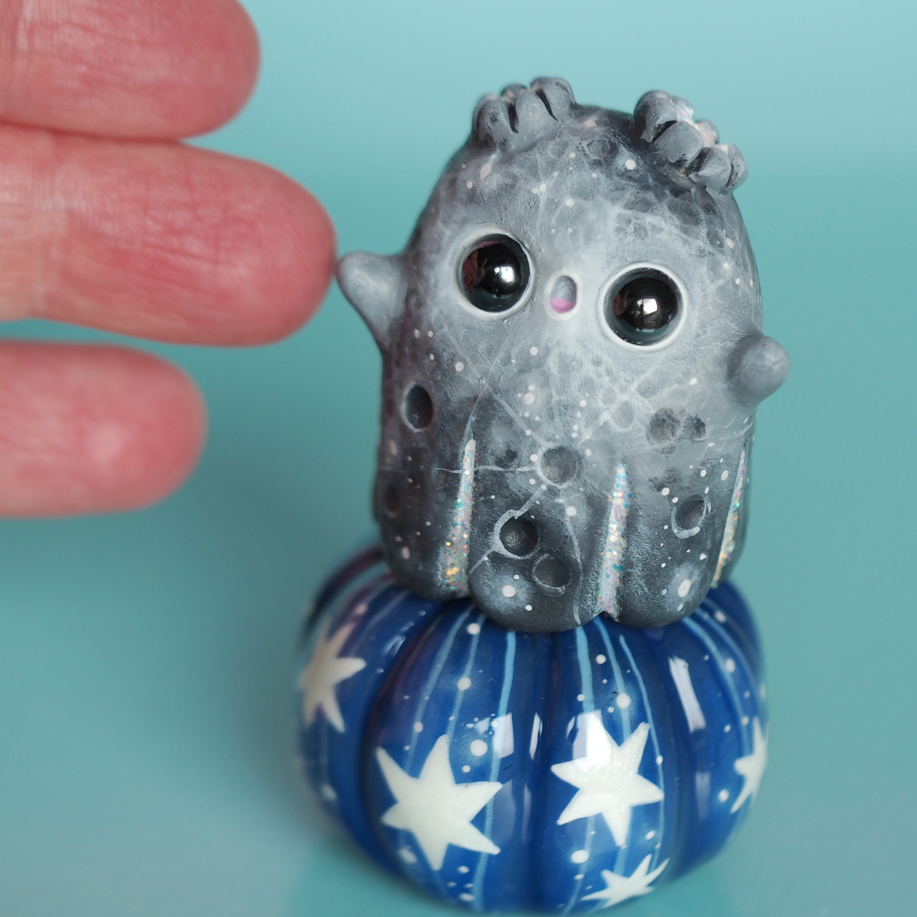 This sweet Ghostie has been sculpted by hand out of polymer clay — no molds were used in the process. After curing, the piece was carefully hand-painted with acrylic paints, featuring plenty of tiny details! Luna has a matte finish. The starry pumpkin has a captivating glass-like shine.  This piece is signed by the artist.