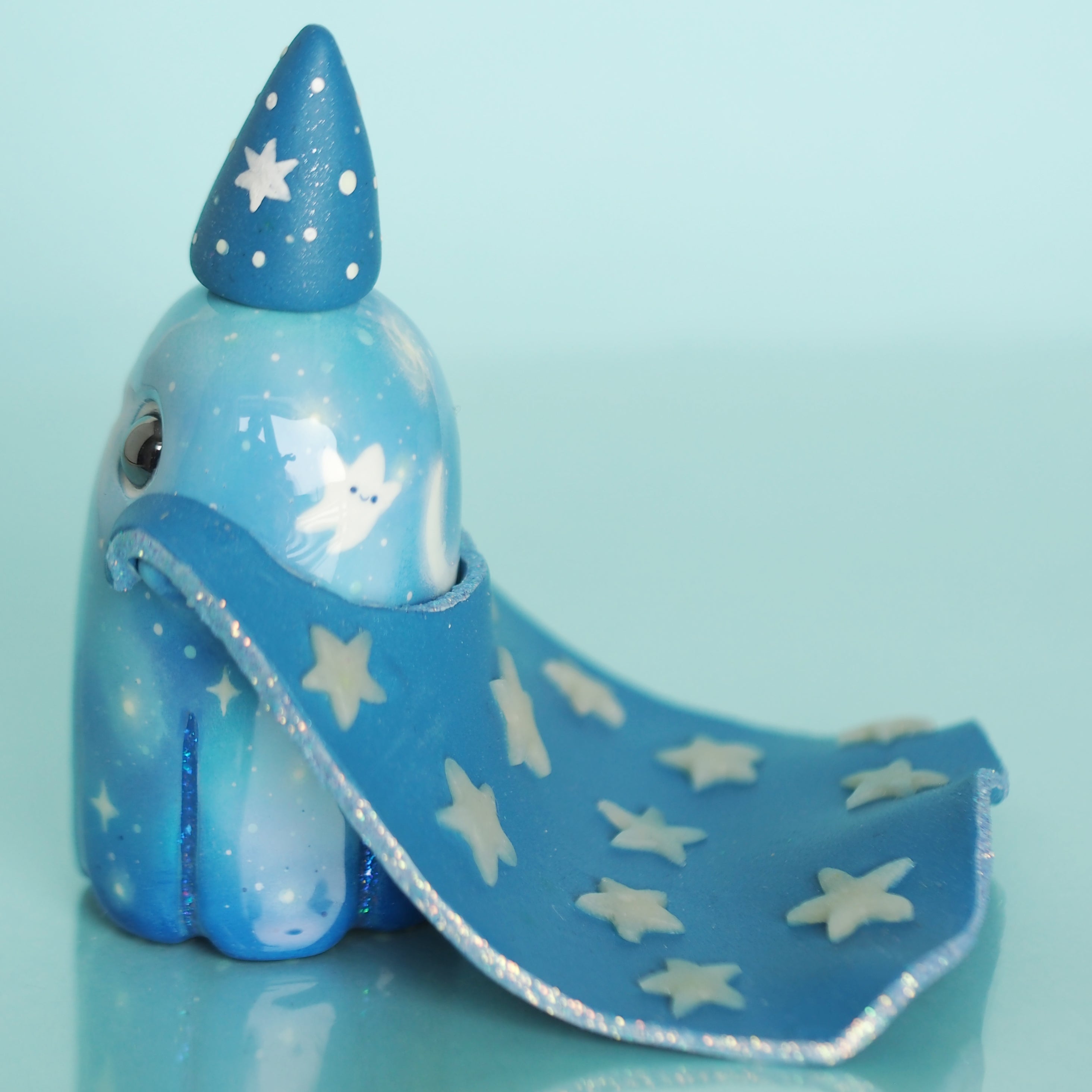 This piece is sculpted by hand out of polymer clay, painted with acrylic paint and sealed with varnish in order to create that glass-like shine. The hat and the cape have a matte finish. This piece is part of the Star Garden and is signed by the artist.